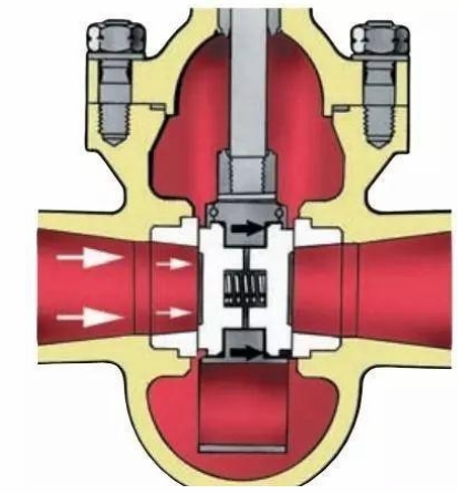 平板閘閥閥門關閉:流體壓力 (箭頭指示)使出口側的閥瓣與閥座接觸。